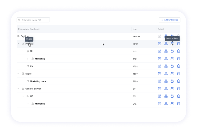 Structure teams effortlessly with multi-level hierarchy. Keep subsidiaries independent yet connected. Invite, remove, or reassign users in bulk—no more manual hassles.